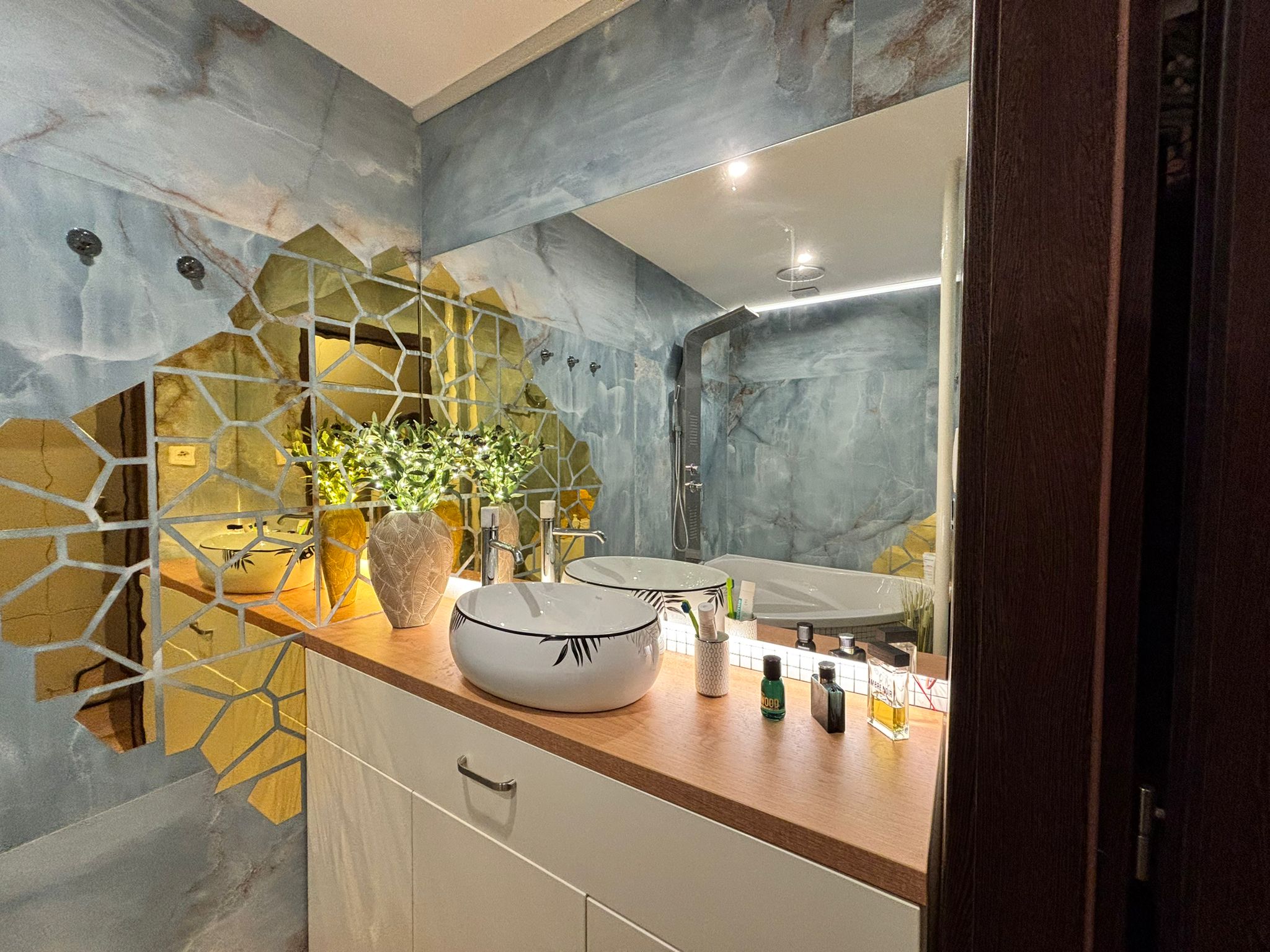 modernú kúpeľňu s rohovou vaňou