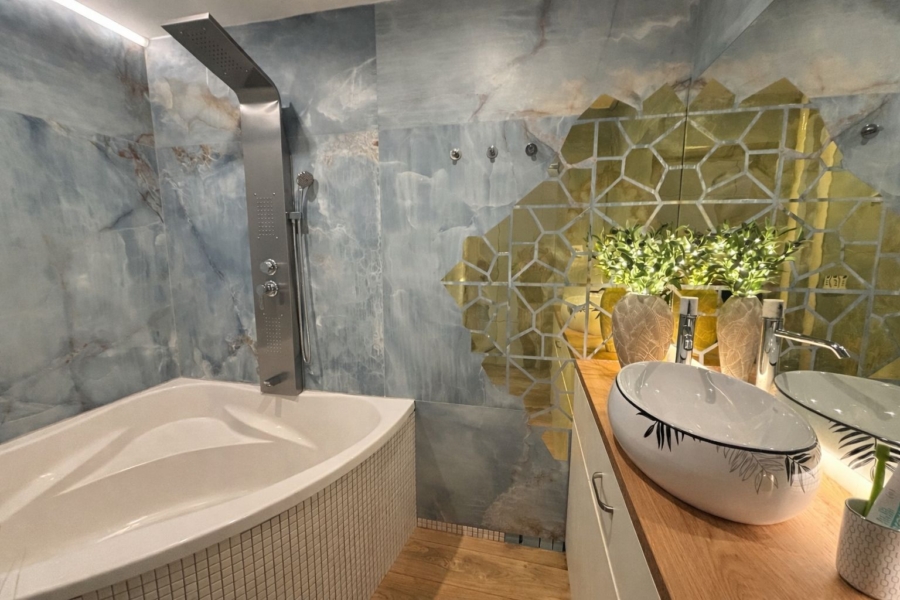 modernú dlažbu v kúpeľni a WC